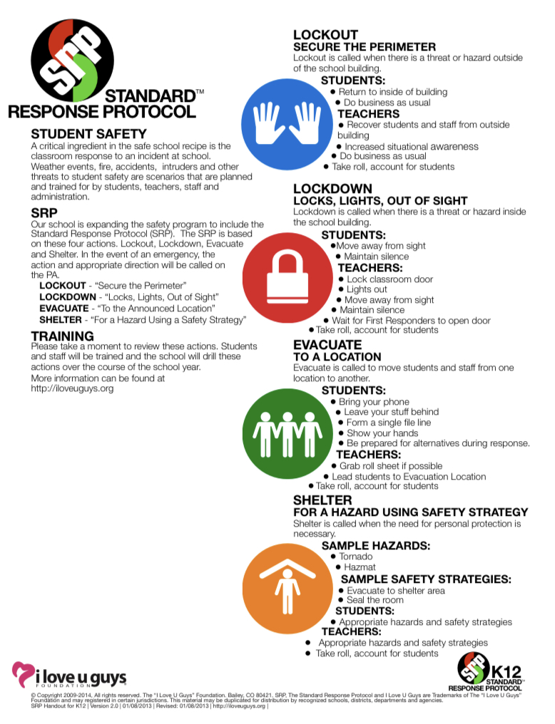 The shelter-in-place protocol provides safe refuge for students, staff and visitors at the school. This might include a situation taking place in the community, near the proximity of the school or a biohazard situation. During a shelter-in-place, students and staff will remain indoors with the doors locked, as directed by either law enforcement or the school principal, although the educational learning environment may proceed as usual.