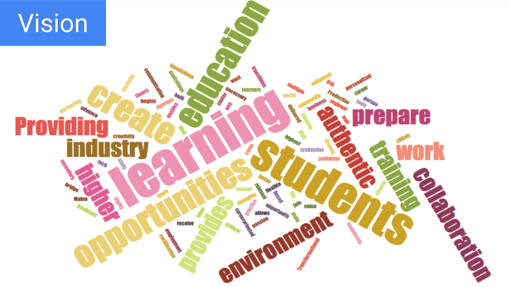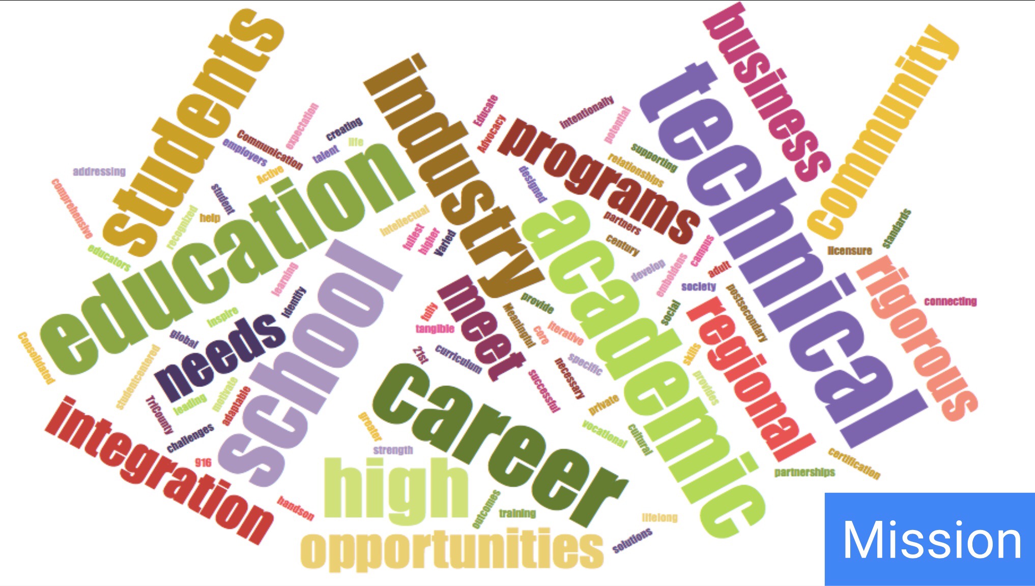 The committee worked to develop and identify common language to help define the mission and vision of this project going forward, and that language can be seen through the attached “Word Clouds.” In case you are unfamiliar, word clouds are a tool that takes a bulk of text and words and puts them into a “cloud” type format. The more common the word is found in the text, the bigger the word gets. This tool will help the team identify the core values, beliefs, and intentions of what the project mission and vision will be, and then lead to the crafting and designing of the mission and vision statements.